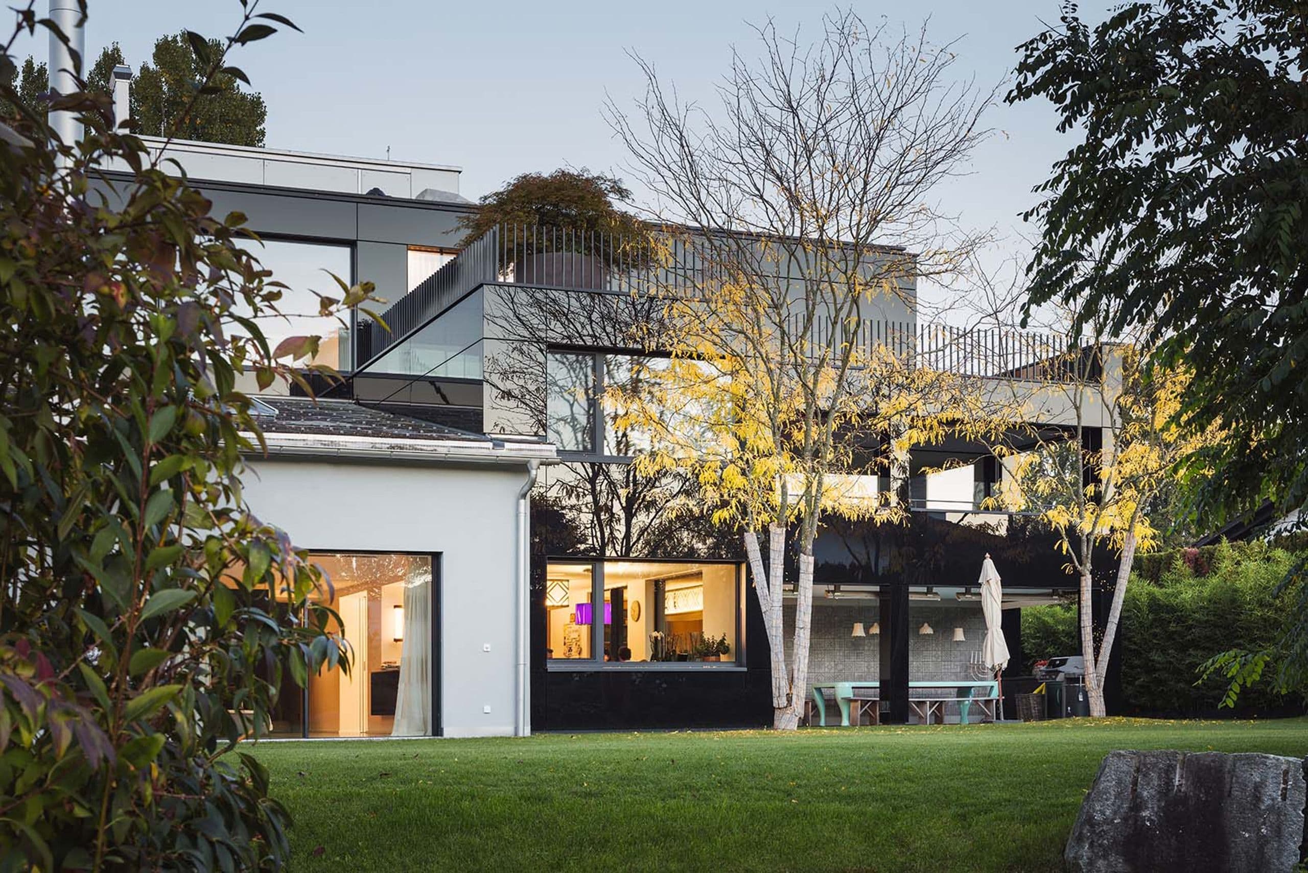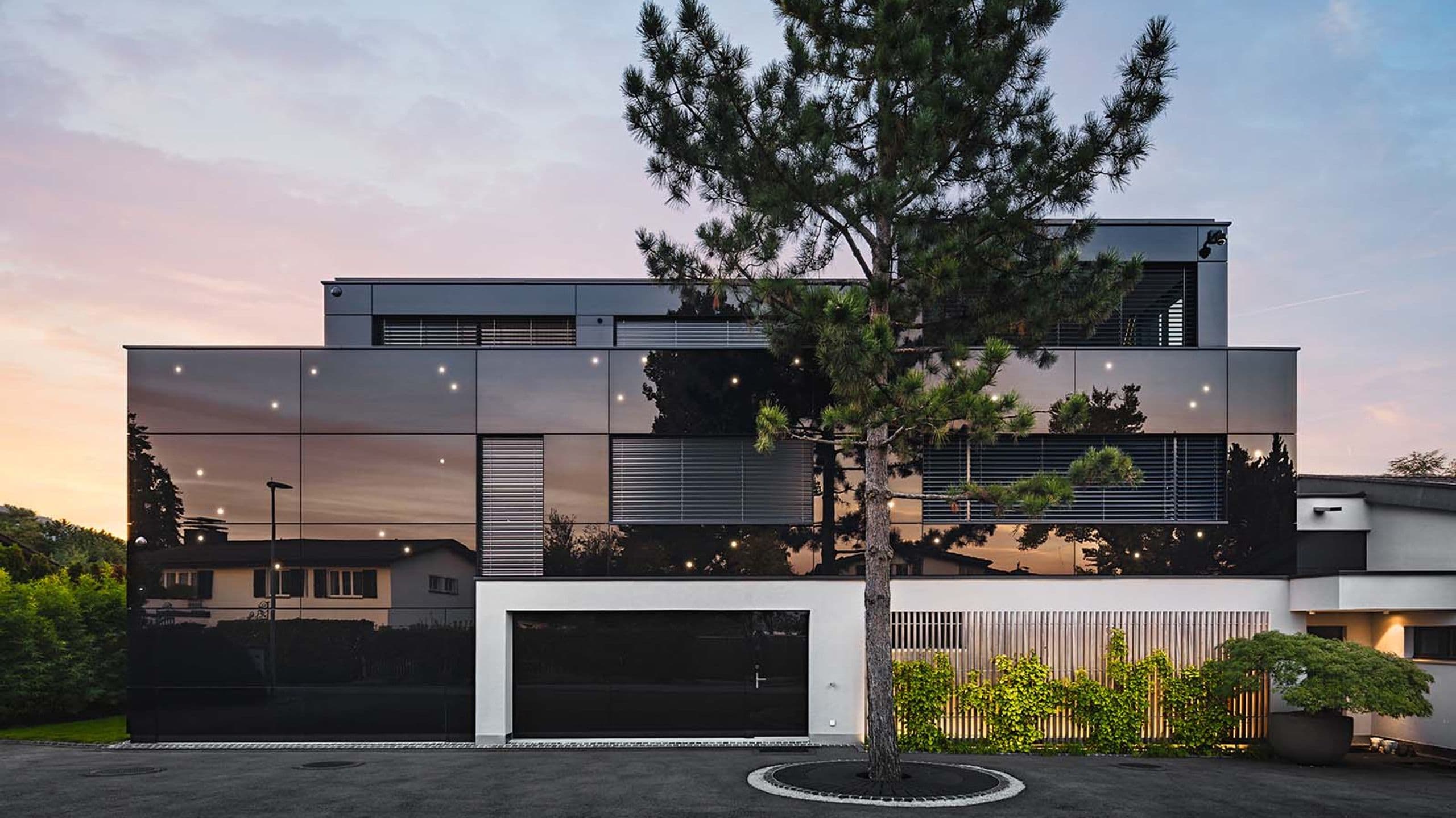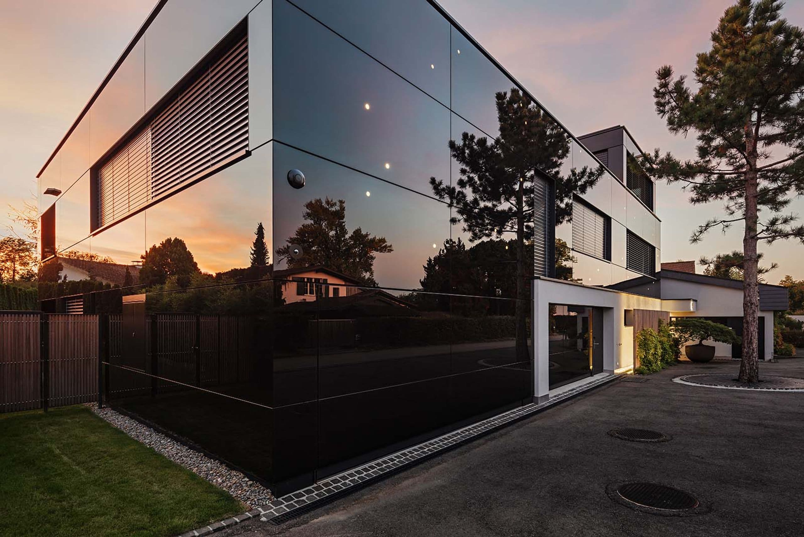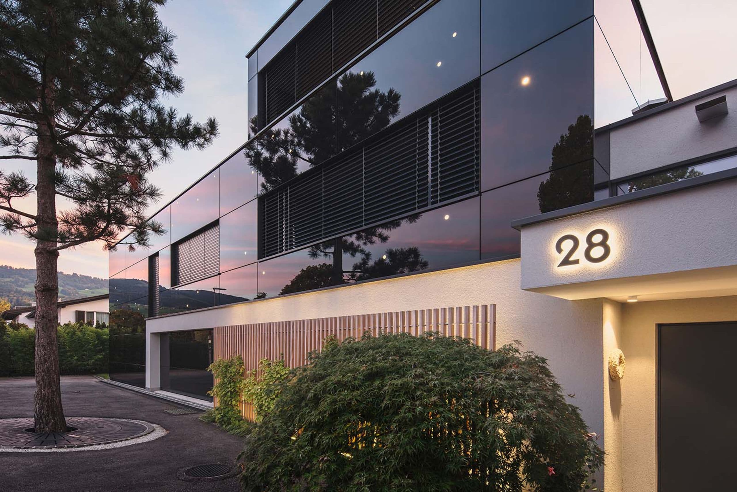 Die schwarze Glasfassade entstand mittels Structural Glazing, einer speziellen Fassadenbautechnik (siehe unten). Durch die rahmenlose Konstruktion erscheint die Fassade wie ein einziges, fliessendes Element, das der Gebäudehülle Tiefe, Raffinesse und Eleganz verleiht. Neben der Fassade haben wir auch die Eingangstüre und die Fenster gestaltet.